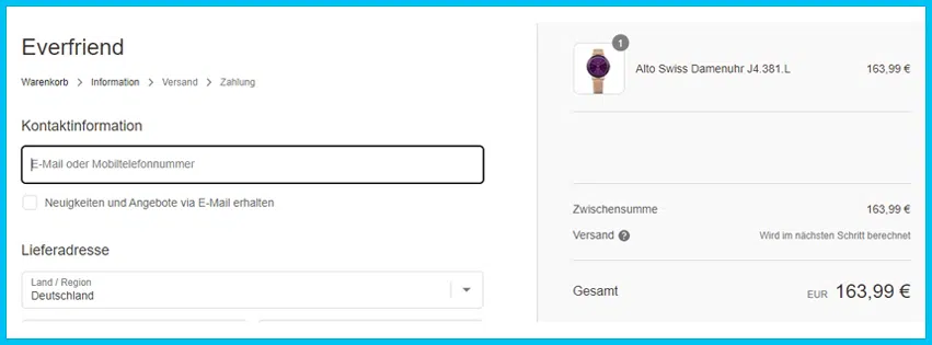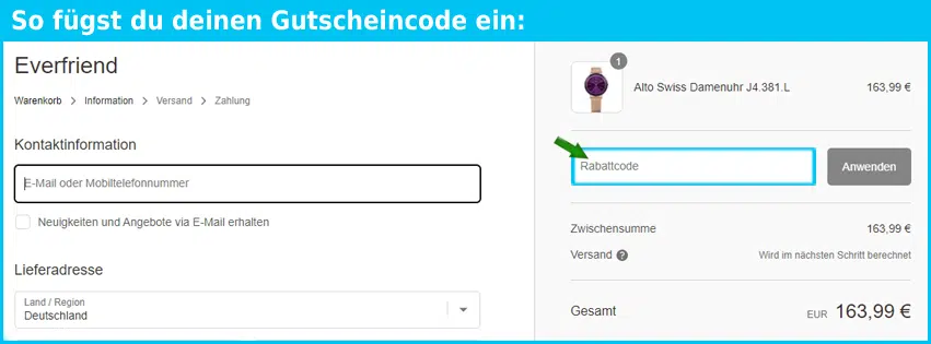 Im Warenkorb findest Du nun das everfriend Gutschein Feld relativ weit unten. Kopiere deinen Code dort hinein und drücke auf den grünen Pfeil zum Einlösen. Bei Anwendbarkeit wird dir der Rabatt unmittelbar angezeigt.