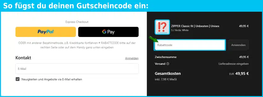 • Gutschein einlösen: Füge den kopierten Gutscheincode in das dafür vorgesehene Feld beim Checkout ein und klicke auf „Einlösen“. Der Rabatt wird dann automatisch von deinem Gesamtbetrag abgezogen.