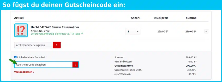 Lege die Artikel, die Du bestellen möchtest, in den Einkaufskorb des hecht-garten Onlineshops und melde Dich anschließend mit deinen persönlichen Daten an. In der Bestellübersicht siehst Du eine Liste mit allen jenen Produkten, die Du bestellen möchtest. Unmittelbar darunter findest Du das Feld zum Einlösen deines persönlichen hecht-garten Gutscheincodes. Trage dort einfach den vorher kopierten hecht-garten Gutschein ein.