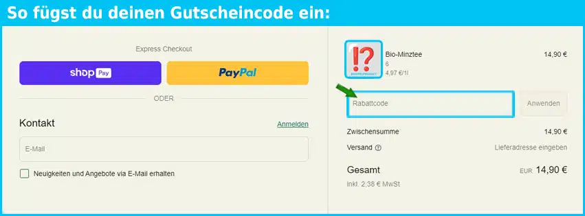 - Gutschein einlösen: Füge den kopierten Gutscheincode in das dafür vorgesehene Feld beim Checkout ein und klicke auf „Einlösen“. Der Rabatt wird dann automatisch von deinem Gesamtbetrag abgezogen.