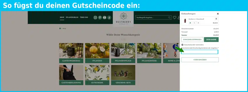 Lege die Artikel, die Du bestellen möchtest, in den Einkaufskorb des restberry Onlineshops und melde Dich anschließend mit deinen persönlichen Daten an. In der Bestellübersicht siehst Du eine Liste mit allen jenen Produkten, die Du bestellen möchtest. Unmittelbar darunter findest Du das Feld zum Einlösen deines persönlichen restberry Gutscheincodes. Trage dort einfach den vorher kopierten restberry Gutschein ein.